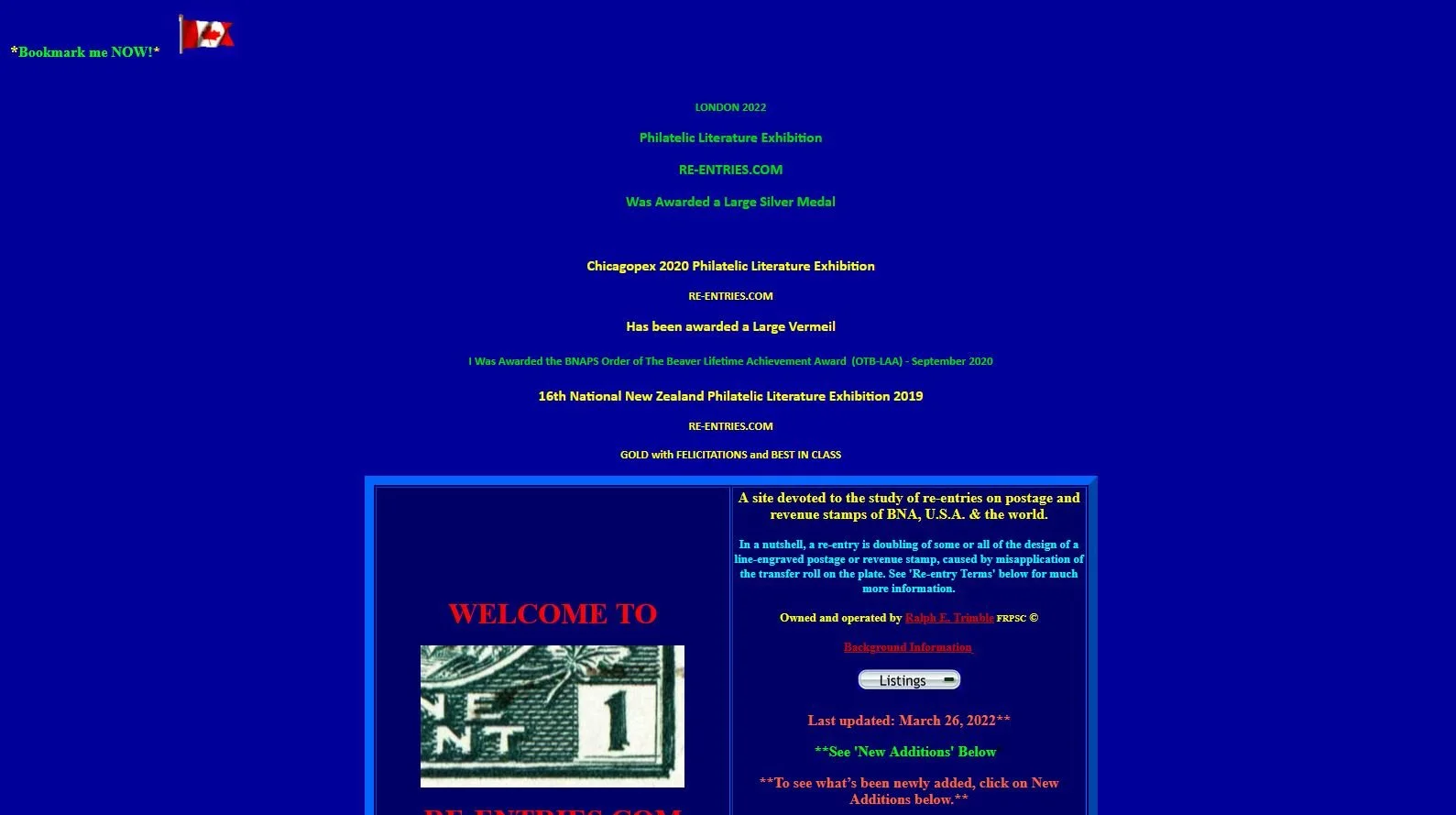 Re-entries.com was awarded a Large Silver Medal at the Philatelic Literature Exhibition in London 2022, Large Vemeil at the Chicagopex 2020 Philatelic Literature Exhibition, and Gold with Felicitations and best in class at the 16th National New Zealand Philatelic Literature Exhibition in 2019.